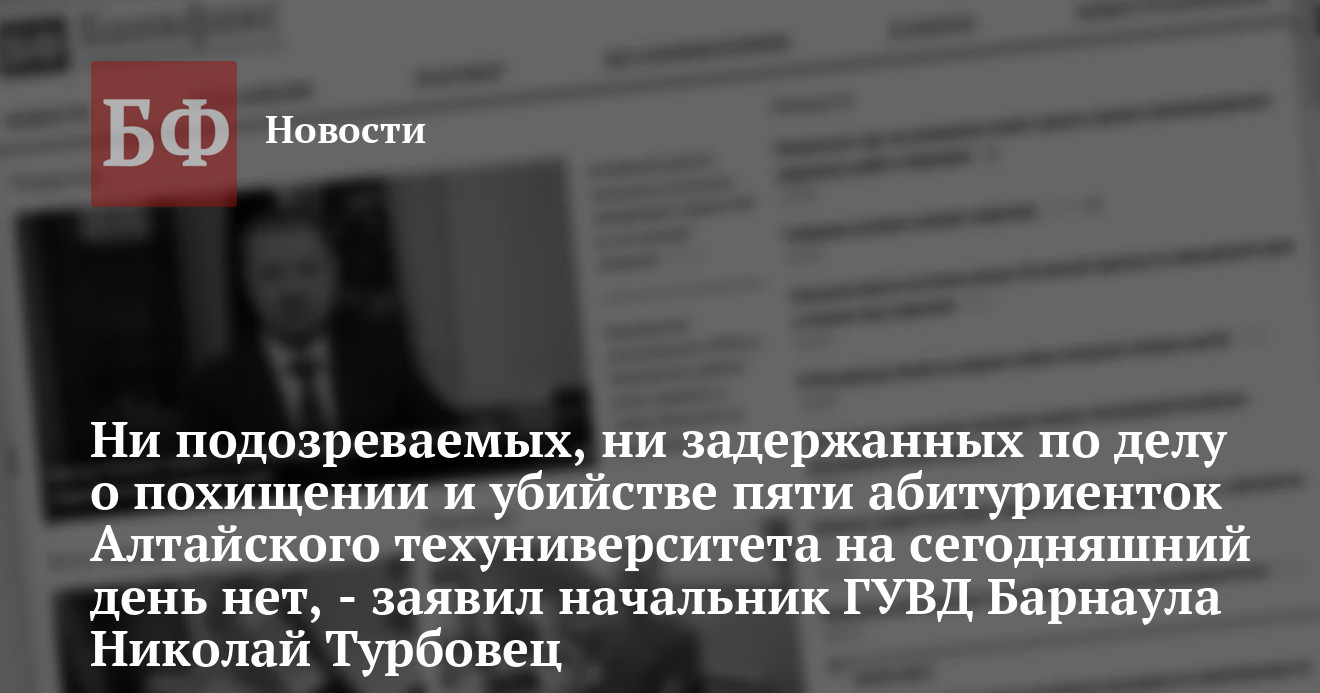 По словам Турбовца, Александр Анисимов, 1 ноября выбросившийся из окна девятиэтажного дома во время проведения следственного эксперимента, был арестован правоохранительными органами за хранение обреза, по которому сейчас проводятся экспертизы на предмет его возможного использования в преступных действиях. Начальник ГУВД заявил, что Анисимову не было предъявлено обвинение по делу об убийстве 5 девушек-абитуриенток Алтайского технического университета. Он обвинялся лишь в незаконном хранению оружия, а 1 ноября намеревался показать следственной группе, где хранятся спрятанные им «запрещенные предметы», назвать которые представители следствия отказались. Николай Турбовец также сообщил, что по последнему фотороботу мужчины, подозреваемого в похищении девушек, следствию поступило порядка 40 звонков от населения. Большая часть из них уже отработана. По одному из звонков сыщики вышли на торговца обувью Анисимова, реальная внешность которого оказалась очень похожей на фоторобот. Анисимов был задержан 27 октября и через 5 дней дознания покончил с собой. По имеющимся данным, в период дознания Анисимов пользовался услугами адвоката, утверждавшего, что его клиент подвергался дознанию также и по делу о пропавших девушках.