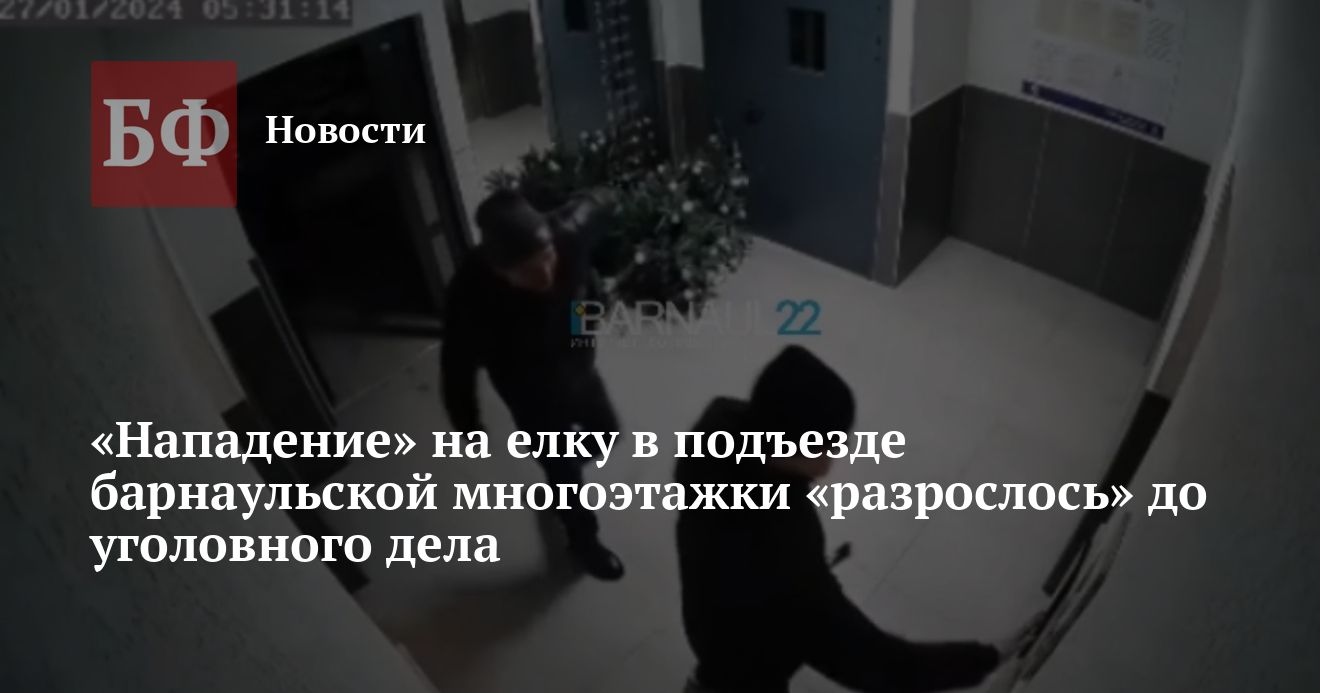 27 января интернет-сообщество Barnaul 22 опубликовало видео с камер, установленных в одном из подъездов многоквартирного дома на улице Солнечная Поляна, 81. На нем изображено, как в 5:31 того же дня два молодых человека заходят в холл подъезда. Впереди идущий парень ударом ноги сбивает установленную в помещении новогоднюю ель, а его попутчик пытается повторить действие, но не дотягивается до дерева. Затем хулиганы проходят в лифт, где один из них делает гримасу, изгибаясь назад.