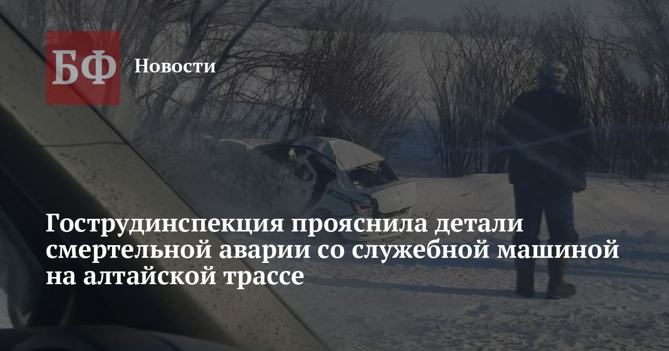Алтайская Гострудинспекция расследует гибель сотрудника Сибирского регионального центра судебной экспертизы, подведомственного Минюсту России. Он скончался в результате ДТП, произошедшего 15 февраля на Чуйском тракте в Бийском районе. Тогда некоторые паблики и СМИ сообщали, что в аварию попал автомобиль службы судебных приставов, однако это не соответствовало действительности.
