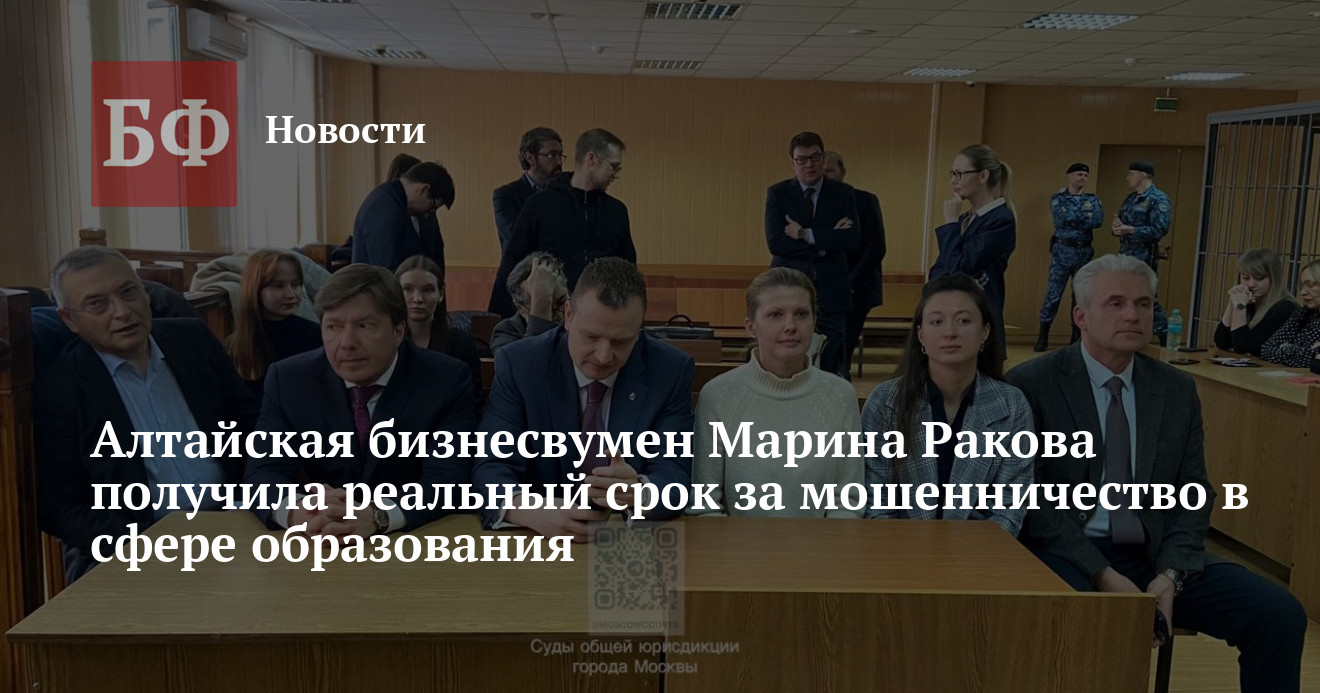 В Никулинском районном суде Москвы 19 марта озвучили приговор уроженке Алтайского края, экс-замминистра просвещения Марине Раковой и ее подельникам. Всех их признали виновными в мошенничестве, однако лишь бывшая чиновница получила реальный срок. Об этом сообщает Telegram-канал столичных судов общей юрисдикции.