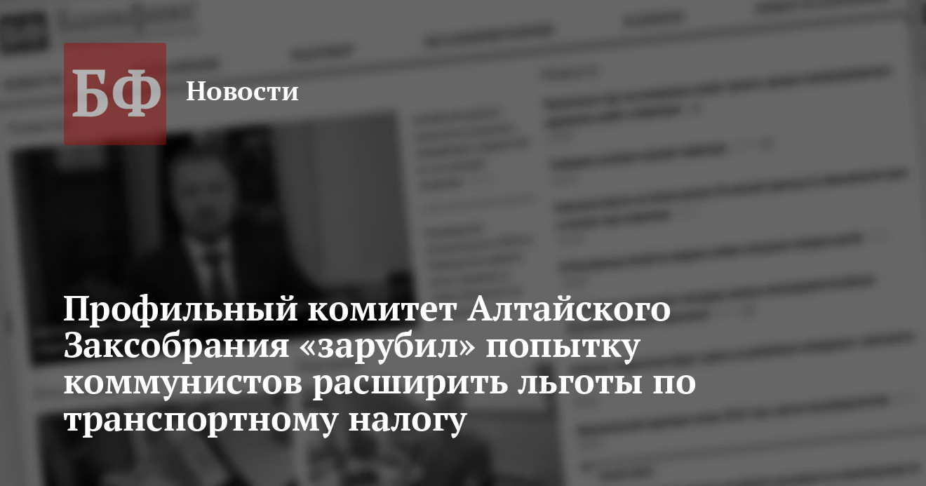 Комитет Алтайского Заксобрания по бюджетной, налоговой, экономической политике и имущественным отношениям вынес отрицательное заключение на законопроект фракции КПРФ по расширению льгот по транспортному налогу. Об этом коммунисты сообщили 27 марта в своем Telegram-канале. Коммунисты ранее предрекали такой исход, поскольку инициативу, судя по всему, планируют сделать «достоянием» всех фракций краевого парламента.