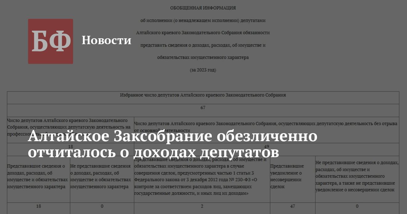 Напомним, что изменения в порядок декларирования доходов парламентариев внесли в 2023 году на федеральном уровне, а затем и на региональном. В результате Алтайское Заксобрание стало публиковать сведения о доходах в таком обобщенном формате и без упоминания каких-либо сумм. Однако есть и другие примеры. Так, Заксобрание Санкт-Петербурга публикует заработки депутатов, но обезличено, например, «депутат 1 — 5 028 059,23», «депутат 2 — 4 685 876,96» и т. д. В этом плане АКЗС больше походит на Мосгордуму, где сведения такие же обобщенные.