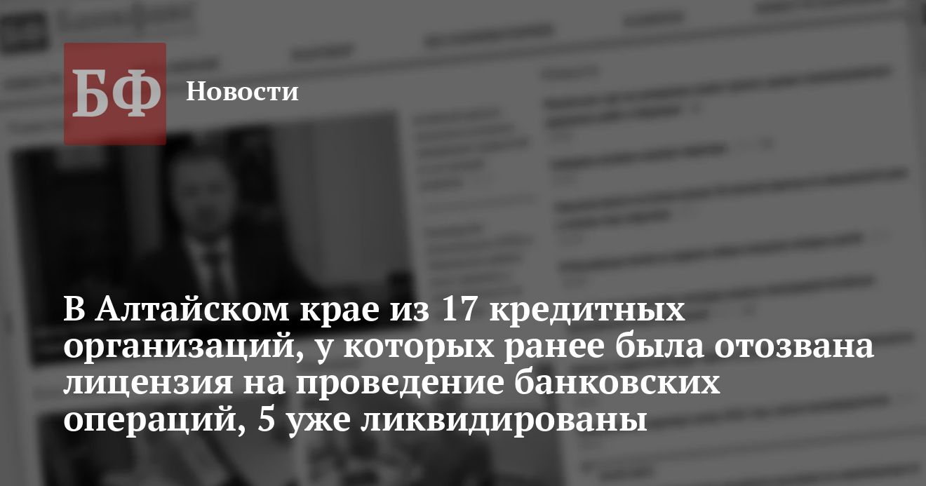 Как сообщили пресс-службе Главного управления Центрального банка Российской Федерации по Алтайскому краю, из 17 кредитных организаций, у которых ранее была отозвана лицензия на проведение банковских операций, закончено проведение ликвидационных процедур и в соответствии с приказами Банка России в «Книге государственной регистрации кредитных организаций» аннулированы записи о регистрации 5 кредитных организаций Алтайского края: КБ «Рекорд» (ликвидирована запись