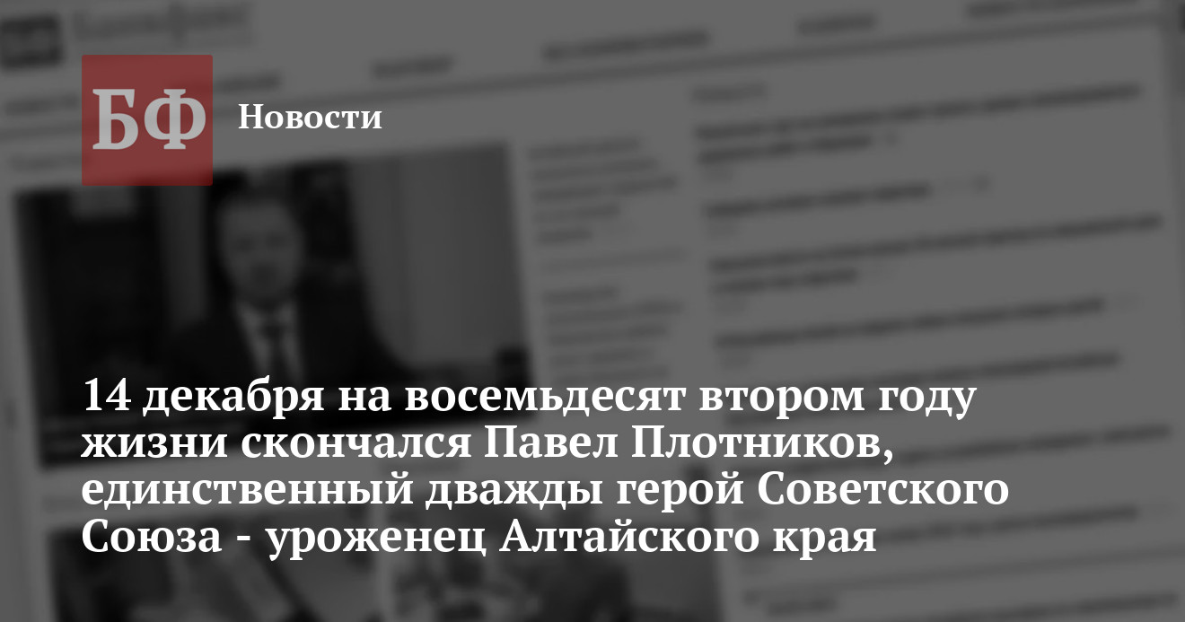 Как стало известно, 15 декабря в Москве состоялись похороны Павла Плотникова, единственного уроженца Алтайского края, удостоенного званием дважды героя Советского Союза. Бронзовый бюст Плотникова установлен в Барнауле на площади Свободы.