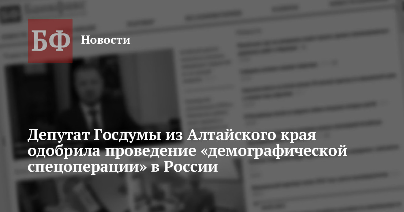 Уроженка Алтайского края, глава комитета Госдумы по вопросам семьи, женщин и детей Нина Останина согласилась с идеей провести в России «демографическую спецоперацию» для решения демографической проблемы в стране. Об этом она заявила на стратегической сессии «Демографический суверенитет как основа экономического развития» на Восточном экономическом форуме.
