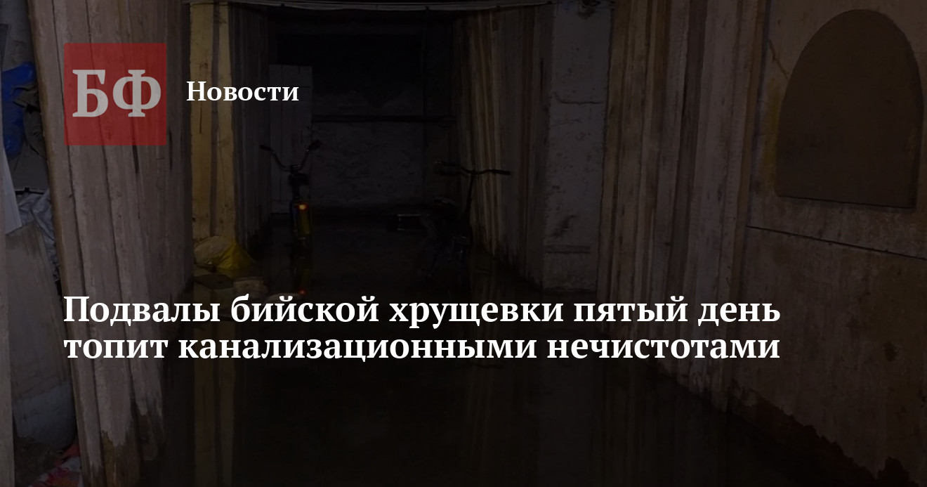 Жители дома по адресу Ленинградская, 113 в Бийске рассказали журналистам, что пятый день подвалы топит канализационными водами из-за возникшей аварии. Горожане отметили, что сразу же после обнаружения потопа обратились в водоканал. Со слов председателя домового комитета Марины Черной, специалисты приехали спустя сутки. Они посмотрели подвалы подъездов и уехали, сказала бийчанка. Женщина сообщила журналистам, что откачка нечистот не ведется, потому что у водоканала вроде бы нет техники и много заявок. Тем не менее жильцы недовольны, что из подвала исходит неприятный запах. «Подвал полный, замыкание скоро будет, потому что вода уже к щитовой подошла <…> Без света остаемся, коллапс, настоящий коллапс», — добавила обеспокоенная жительница дома Тамара Трофимова.