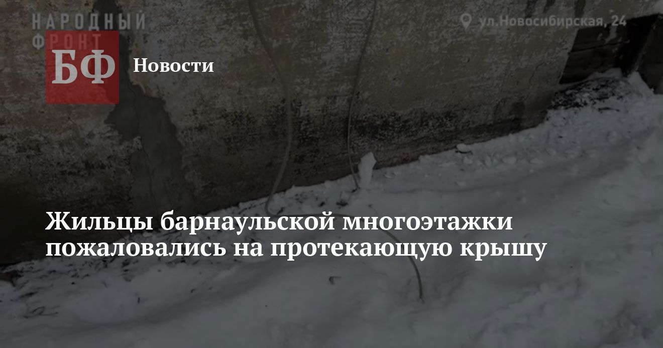 Жители дома по улице Новосибирская, 24 в Барнауле обратились в «Народный фронт» с жалобой на плохое состояние крыши. По их словам во время недавней оттепели снег начал таять, и вода хлынула в квартиры на верхних этажах. Причем такая ситуация происходит уже не в первый раз. «Как дожди были, так всегда у нас текло. У меня даже люстры не висят, так как лампочки перегорают. Как дожди идут, так все льет и льет. Ходил в управляющую компанию. Вот, ждем-ждем, все бесполезно», — рассказал волонтерам «Народного фронта» жилец дома Сергей Семенов.