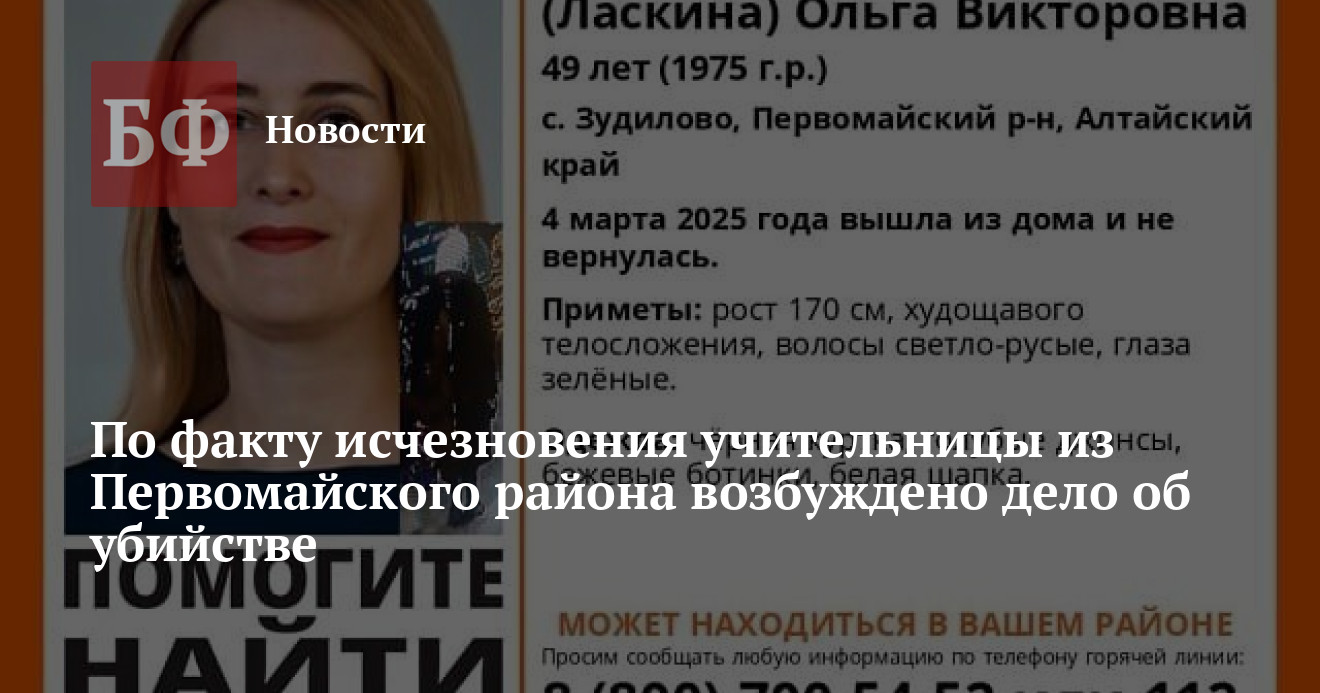 Отмечается, что в день пропажи она предупредила родных, что отправилась в школу, но на работе не появилась. Также она прекратила выходить на связь. Днем ее видели в магазине в селе Березовка. В день исчезновения женщина была одета в пуховик черного цвета удлиненный, шапку белого цвета, ботинки белого цвета. По факту исчезновения Ольги Залит Новоалтайским межрайонным следственным отделом СУ СК РФ по Алтайскому краю было возбуждено уголовное дело по ст. 105 УК РФ (убийство).