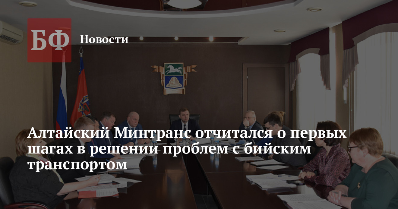Заседание межведомственной рабочей группы по улучшению работы общественного транспорта в Бийске провел министр транспорта Алтайского края Андрей Подолян. На совещании также присутствовали министр промышленности и энергетики региона Вячеслава Химочка, мэр Бийска Виктор Щигрев, представители краевого управления имущественных отношений, прокуратуры Бийска и другие заинтересованные лица.