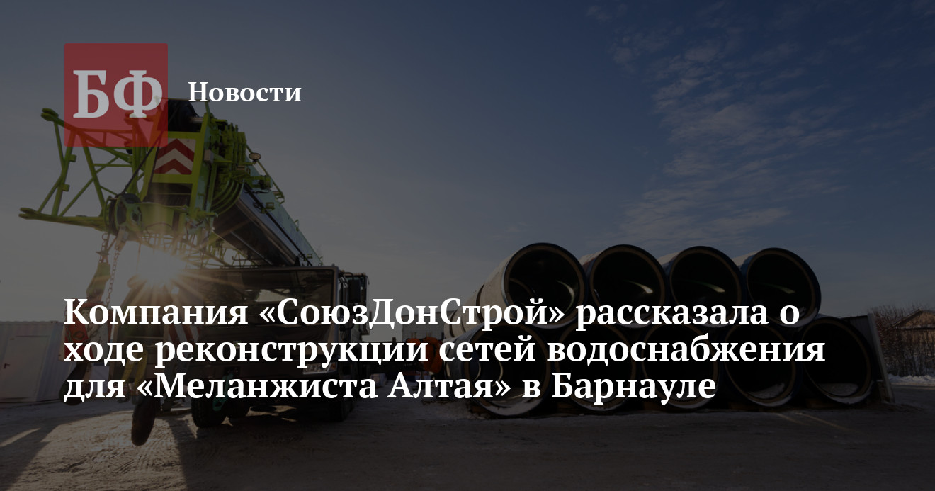 В настоящее время компания «СоюзДонСтрой» реализует в краевом центре проект, предполагающий реконструкцию сетей водоснабжения для АО «БМК «Меланжист Алтая». Как отмечают в компании, для обеспечения стабильного роста и экономического развития Барнаулу необходимы качественные инженерные сети, спроектированные с учетом темпов роста нагрузки и увеличения численности населения.