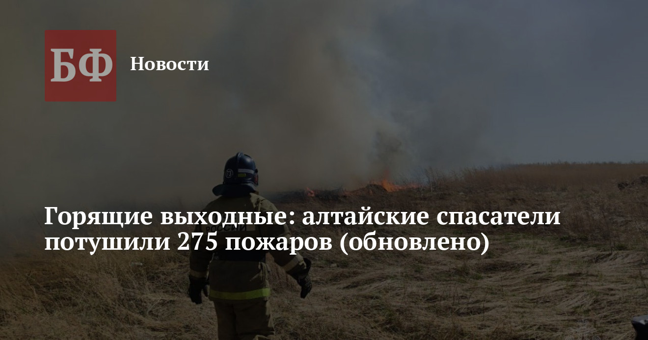 По данным краевого главка МЧС, за выходные спасательные службы устранили 275 пожаров, 206 из которых — возгорания травы. Отмечалось, что в регионе из-за жаркой погоды и больших площадей прошлогоднего сухостоя сложилась напряженная пожароопасная обстановка. Так, огнеборцы ликвидировали серьезный пожар между селами Зерно и Веселоярск Рубцовского района площадью около 3000 кв. м. На месте работало четыре пожарных расчета и тяжелая техника, угрозы населенным пунктам не наблюдалось. Кроме того, в окрестностях Барнаула горели заливные луга. При этом, по информации ведомства, угрозы населенным пунктам и объектам не было. В то же время в Локтевском районе пожарно-спасательные подразделения тушили горящую траву вдоль трассы К-26 вместе с коллегами из Казахстана. Пожар локализовали.