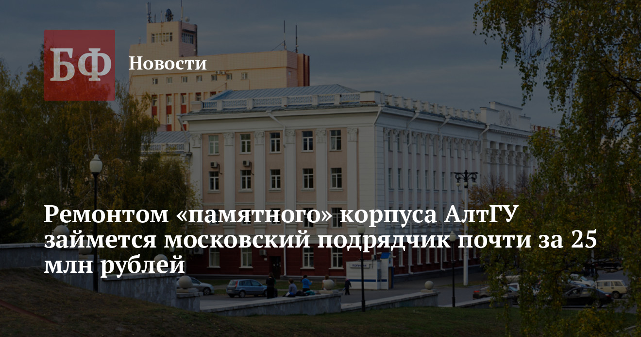 29 апреля Алтайский госуниверситет заключил контракт с ООО «Рост» на капремонт и реставрацию с приспособлением фасадов и крыши учебного корпуса «Л», который находится на проспекте Ленина, 61 в Барнауле. Это здание является объектов культурного наследия. Компания запросила за проведение работ на объекте максимально возможную сумму — более 24,5 млн рублей. Как указано в документации, подрядчик должен выполнить капремонт в пять этапов до 11 ноября 2025 года.