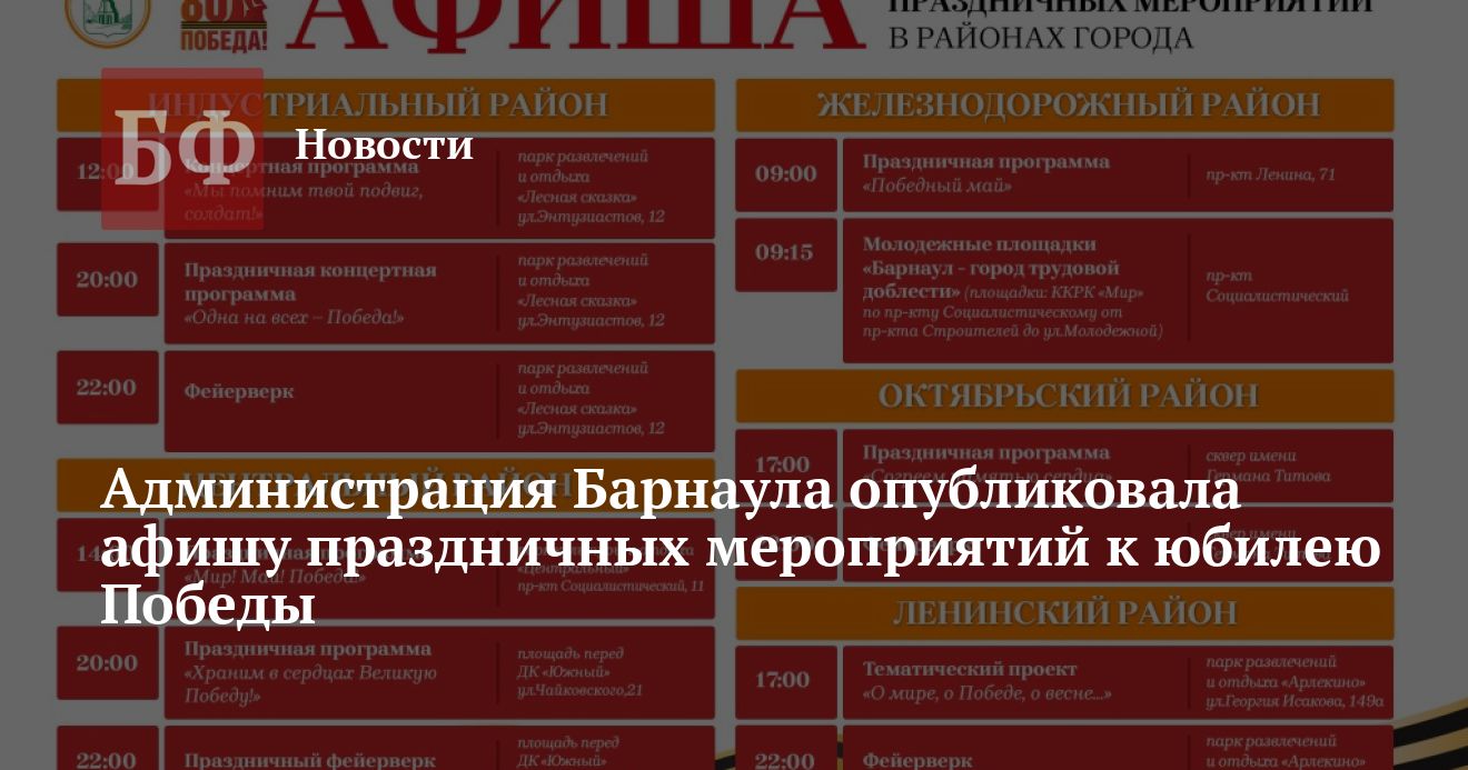 «Основные праздничные мероприятия начнутся на площади Сахарова в 13:00 с программы творческих коллективов города «Ради жизни на Земле». С 15.00 здесь начнется концерт «Сквозь года звучит Победа» творческих коллективов Дома культуры «Центральный». В 16:00 барнаульцы смогут увидеть выступление Барнаульского духового оркестра с программой «Музыка Великой Победы. В 18:00 на площади Сахарова стартует молодежная программа «Мы помним, мы гордимся», а в 20.30 вечерний эстрадный концерт «Победа будет с нами всегда». Кульминацией вечера станет праздничный фейерверк, который прогремит в 22:00», — говорится в сообщении мэрии. Также праздничные мероприятия организованы во всех районах и пригородных поселках Барнаула.