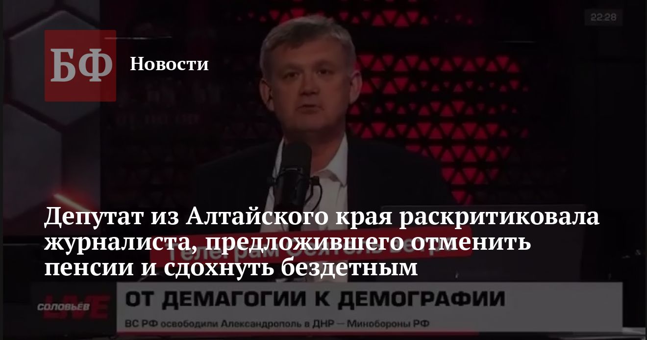 Депутат Госдумы, уроженка Алтайского края Нина Останина назвала неприемлемым выступление журналиста Сергея Мардана, который в своей авторской программе на телеканале «Соловьев Live» предложил отменить пенсии в России и сдохнуть тем, кто не нарожал детей. По ее мнению, это сродни пропаганде геноцида.