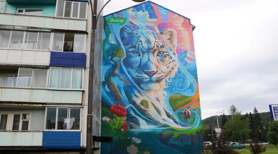 31 мая в Горно-Алтайске открыли мурал с изображением снежного барса. Как сообщает «Толк», его автором стал известный стрит-арт художник Георгий Куринов, также известный как GOOZE ART.