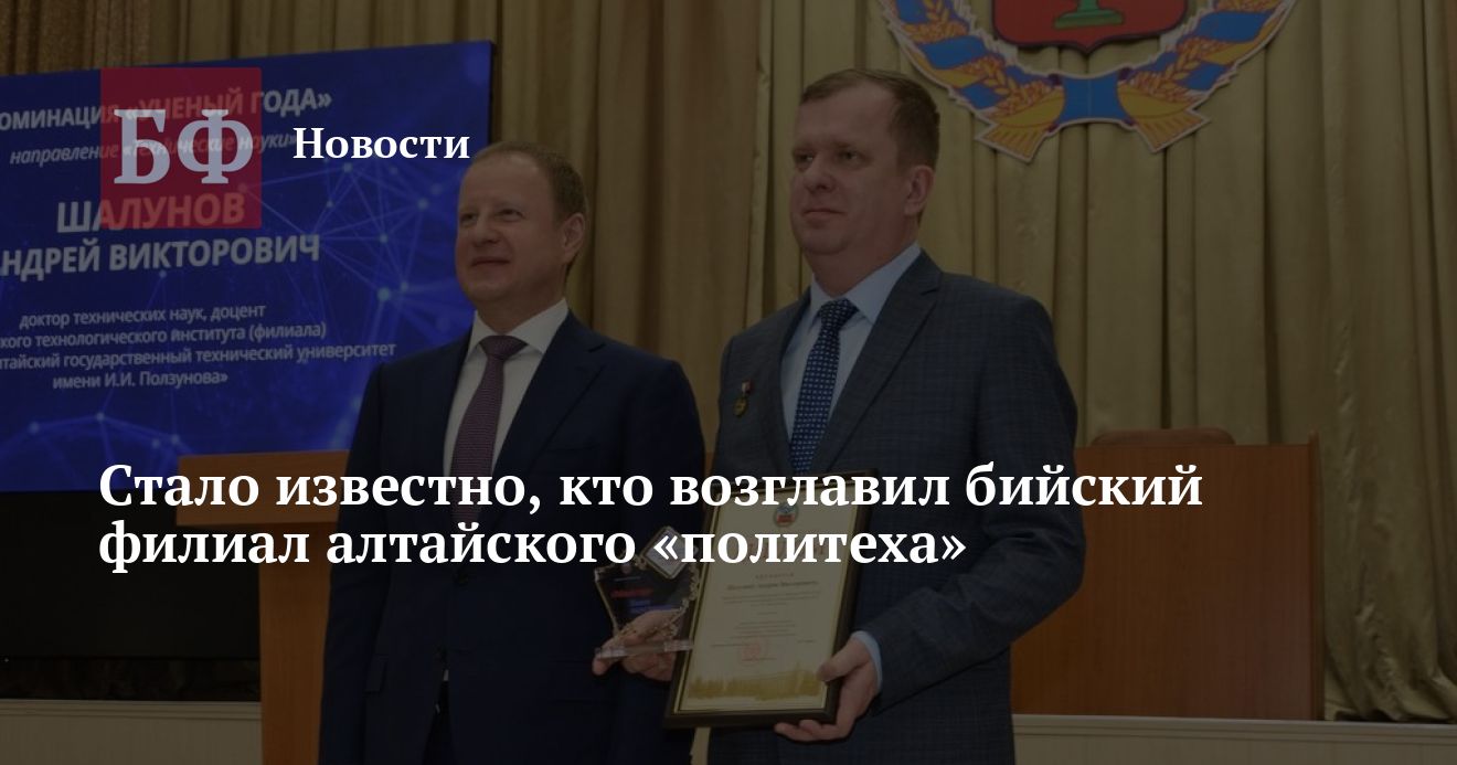 С 3 июня на должность директора филиала АлтГТУ им. И.И. Ползунова - Бийского технологического института (БТИ) - заступил Андрей Шалунов. Как сообщила пресс-служба вуза, ранее он являлся заведующим кафедрой методов и средств измерений и автоматизации (МСИА) БТИ.