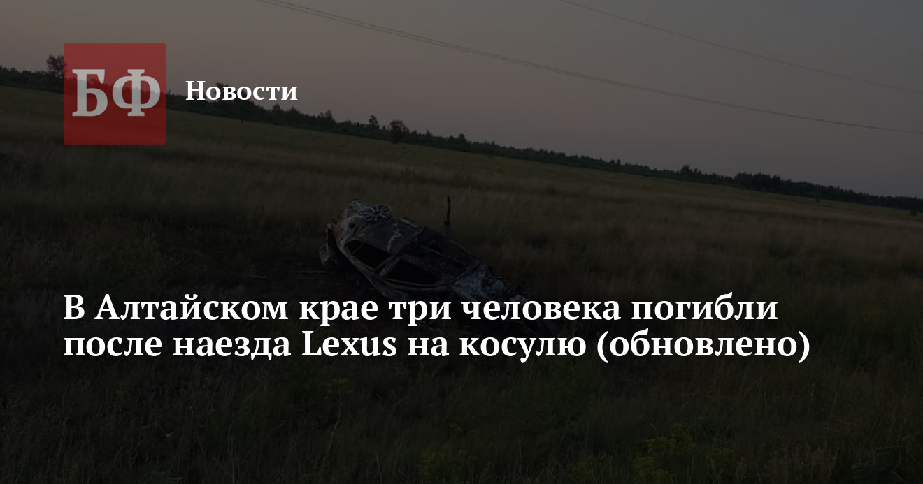 По предварительной информации полиции и прокуратуры Алтайского края, водитель автомобиля Lexus допустил наезд на косулю, после чего иномарка съехала с трассы. Транспортное средство перевернулось и загорелось. В результате ДТП водитель и один из пассажиров скончались на месте, еще одного пассажира доставили в медучреждение. Однако спасти его также не удалось. Что касается автомобиля, то он сгорел полностью. На данный момент возраст и личности погибших устанавливаются.
