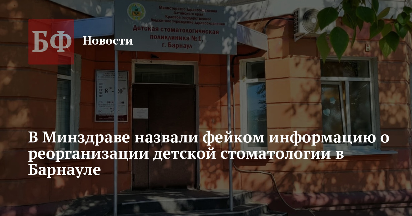 В Министерстве здравоохранения Алтайского края опровергли информацию о реорганизации детской стоматологической поликлиники № 1 в Барнауле. Представители ведомства заявили, что учреждение продолжает работать в штатном режиме. При этом сотрудники поликлиники сообщили ИА «Банкфакс», что весь коллектив находится в подвешенном состоянии и со дня на день ждет появления «того самого приказа».