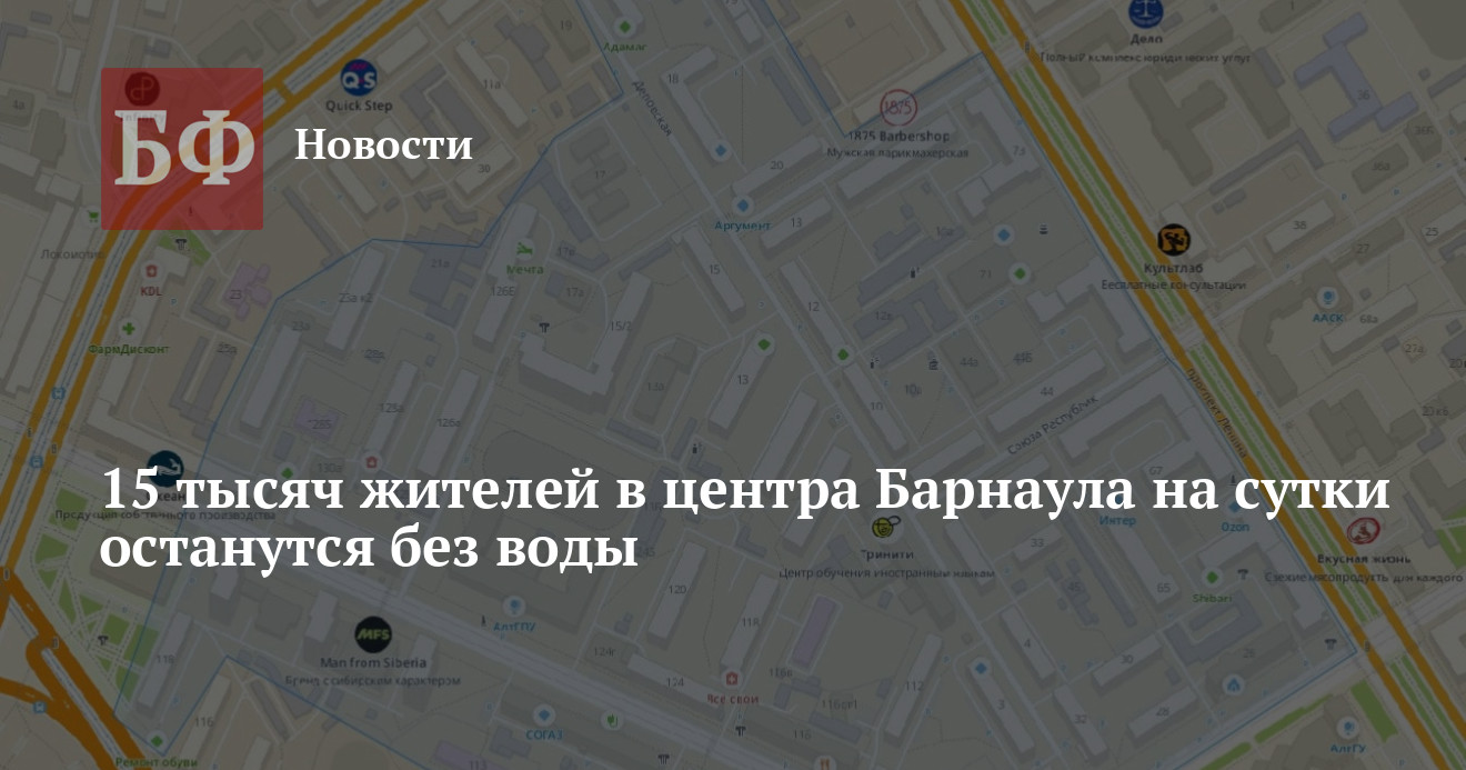В связи с этим с 9:00 21 июля до 9:00 22 июля будет ограничено холодное водоснабжение. Это коснется порядка 15 тысяч человек. Под отключение попадают жилые дома по проспектам Социалистический, Ленина и Красноармейский, улицам Молодежная, Деповская, Союза Республик, а также административные здания на Социалистическом и Молодежной. Еще водоснабжение будет отсутствовать в Краевой стоматологической поликлинике, детской горбольнице № 1, детской поликлинике на проспекте Строителей, 23а, а также в трех детских садах на Социалистическом и в корпусе АГПУ. Кроме того, под ограничение холодного водоснабжения попали бойлерные на Ленина, Социалистическом, Строителей, Молодежной, Деповской, Союза Республик, Брестской.