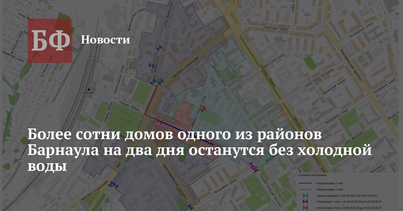 В связи с проведением работ в период с 23.00 8 августа до 08.00 10 августа в центре Барнаула будет поэтапно отключено холодное водоснабжение. Таким образом, без холодной воды останутся 108 многоквартирных домов в Железнодорожном районе. Зоны отключения отмечены на карте. Также горожанам, попавших в зону отключения, посоветовали запастись питьевой водой.