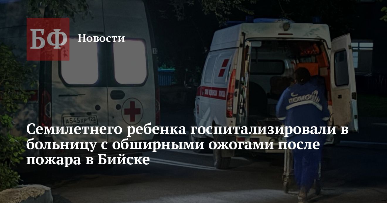 В Бийске медики транспортировали в больницу семилетнего мальчика, который серьезно пострадал на пожаре. Врачи решают вопрос о его госпитализации в краевую больницу, сообщили в Telegram-канале городской станции скорой помощи. Огонь мог вспыхнуть из-за короткого замыкания проводки, рассказали ИА «Банкфакс» в ГУ МЧС по Алтайскому краю.