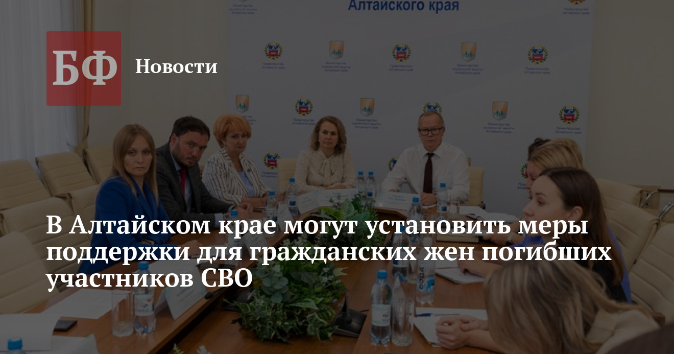 Для обеспечения выплаты гражданским женам участники совещания предложили предусмотреть аналогичные нормы в постановлении правительства Алтайского края «О предоставлении материальной помощи отдельным категориям граждан, принимающим (принимавшим) участие в специальной военной операции, и членам их семей». Игорь Степаненко поручил индивидуально рассматривать каждую ситуацию и по возможности оказывать полный объем социальной помощи.
