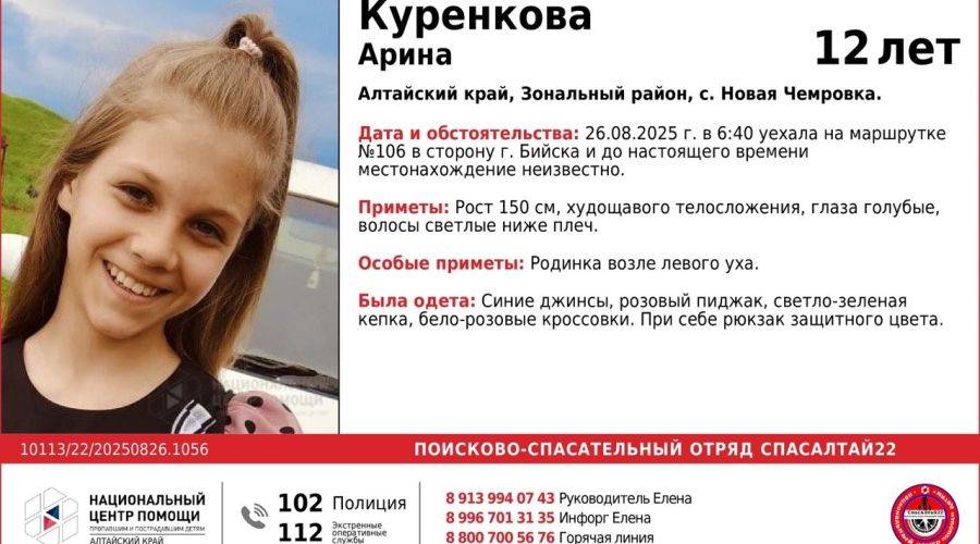 По данным волонтеров, в 6:40 26 августа девочка уехала на маршрутке № 106 в сторону Бийска, и до настоящего момента ее местонахождение не известно. Арина Куренкова одета в синие джинсы, розовый пиджак, светло-зеленую кепку и бело-розовые кроссовки. При себе у подростка находится рюкзак защитного цвета. «Приметы: рост 150 см, худощавое телосложение, глаза голубые, волосы светлые ниже плеч», - говорится в ориентировке. Также у ребенка есть родинка возле левого уха.
