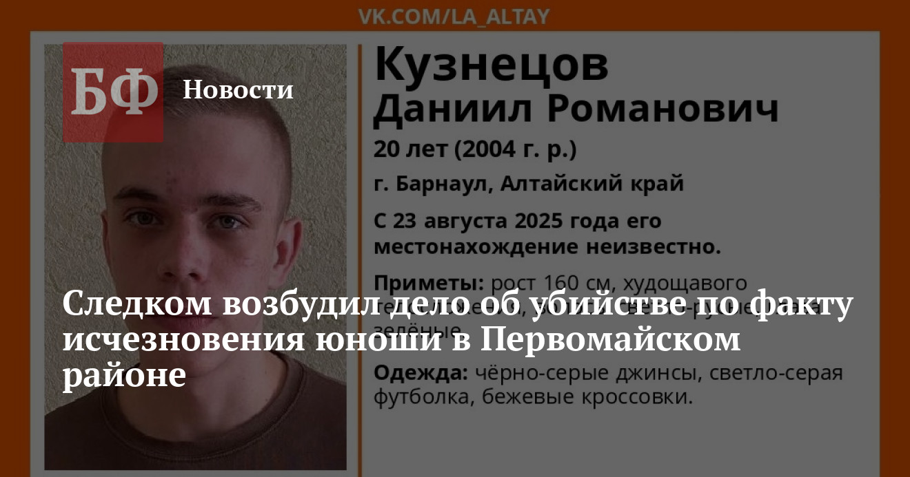 Ранее друзья и родственники Даниила сообщили в соцсетях, что он пропал 23 августа в период с 13:00 до 14:00. Парень ехал со своим коллегой из Барнаула в Березовку. По пути между ними якобы произошел конфликт. Перед подъемом к селу Токарево водитель, который вез Даниила и его коллегу, высадил парня близ бывшей военной части. После этого юношу никто не видел.