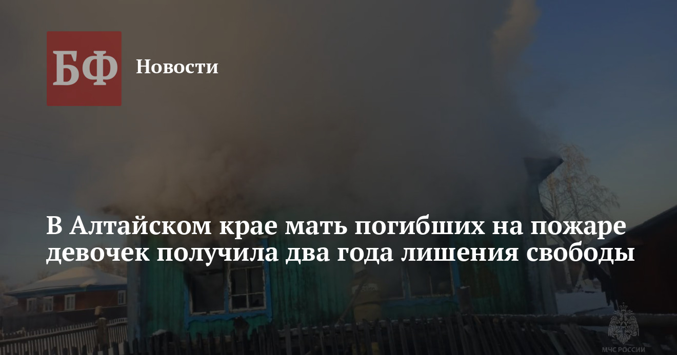 Суд вынес приговор многодетной матери из Панкрушихинского района, по вине которой на пожаре погибло двое детей. Как сообщают пресс-службы СУ СКР по Алтайскому краю и региональной прокуратуры 19 сентября, ее приговорили к двум годам заключения.
