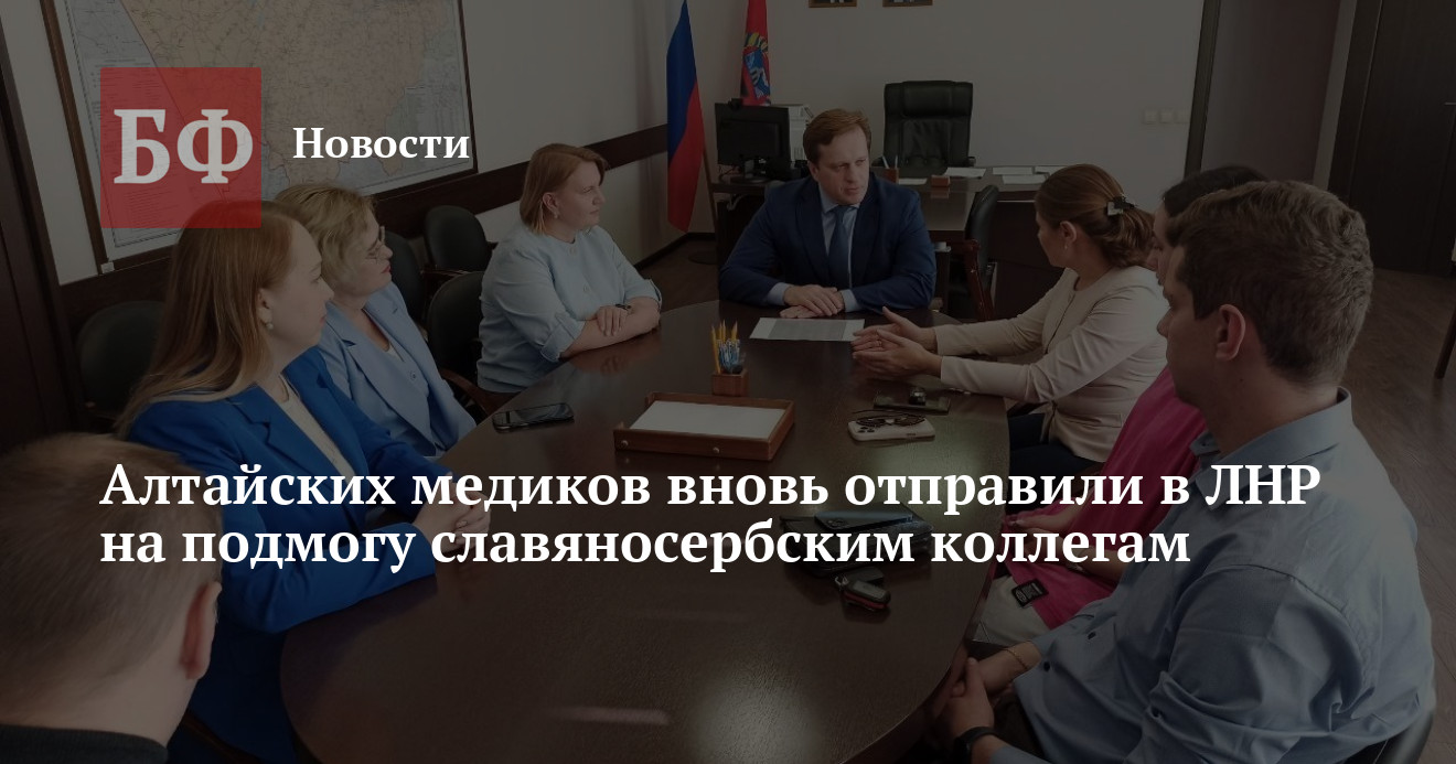 Восемь врачей из Алтайского края приняли решение отправиться на месяц в командировку в Славяносербский округ Луганской Народной Республики (ЛНР). Специалисты будут оказывать помощь своим коллегам в подшефном муниципалитете, сообщили в Минздраве региона.