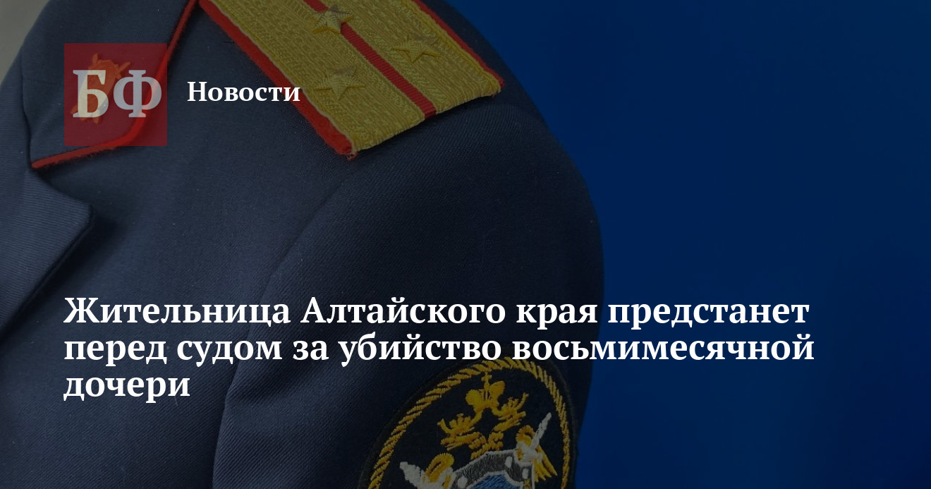 Следком завершил расследование дела жительницы Рубцовского района, которую обвиняют в убийстве своей восьмимесячной дочери. В ближайшее время она предстанет перед судом, сообщают пресс-службы СУ СКР по Алтайскому краю и региональной прокуратуры.