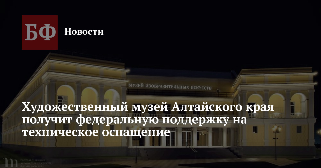 В 2026 году участниками нацпроекта «Семья» станут Каменский районный краеведческий музей и Государственный художественный музей Алтайского края. Учреждения прошли конкурсный отбор и получат из федерального и краевого бюджетов на техническое оснащение 3,8 млн рублей, сообщили 20 октября в региональном министерстве культуры.