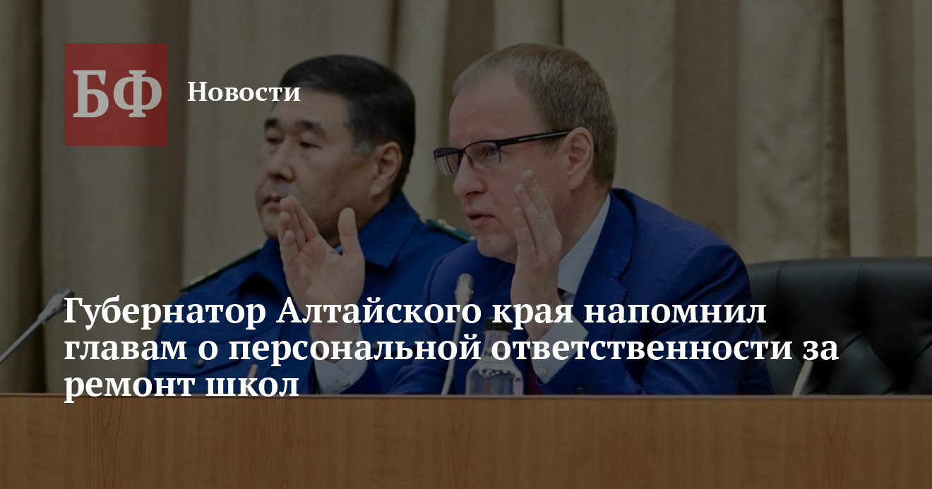 В ходе совещания по вопросам капитального ремонта школ губернатор Алтайского края Виктор Томенко напомнил главам муниципалитетов об их персональной ответственности за проводимые работы. Об этом он сообщил в своем Telegram-канале 2 декабря. Напоминание о контроле за сроком и качеством работ со стороны руководителей муниципальных образований актуально на фоне ситуации со срывом работ на некоторых объектах, в том числе в Советском районе, где главе уже предъявили обвинение в халатности при реконструкции крыши образовательного учреждения.