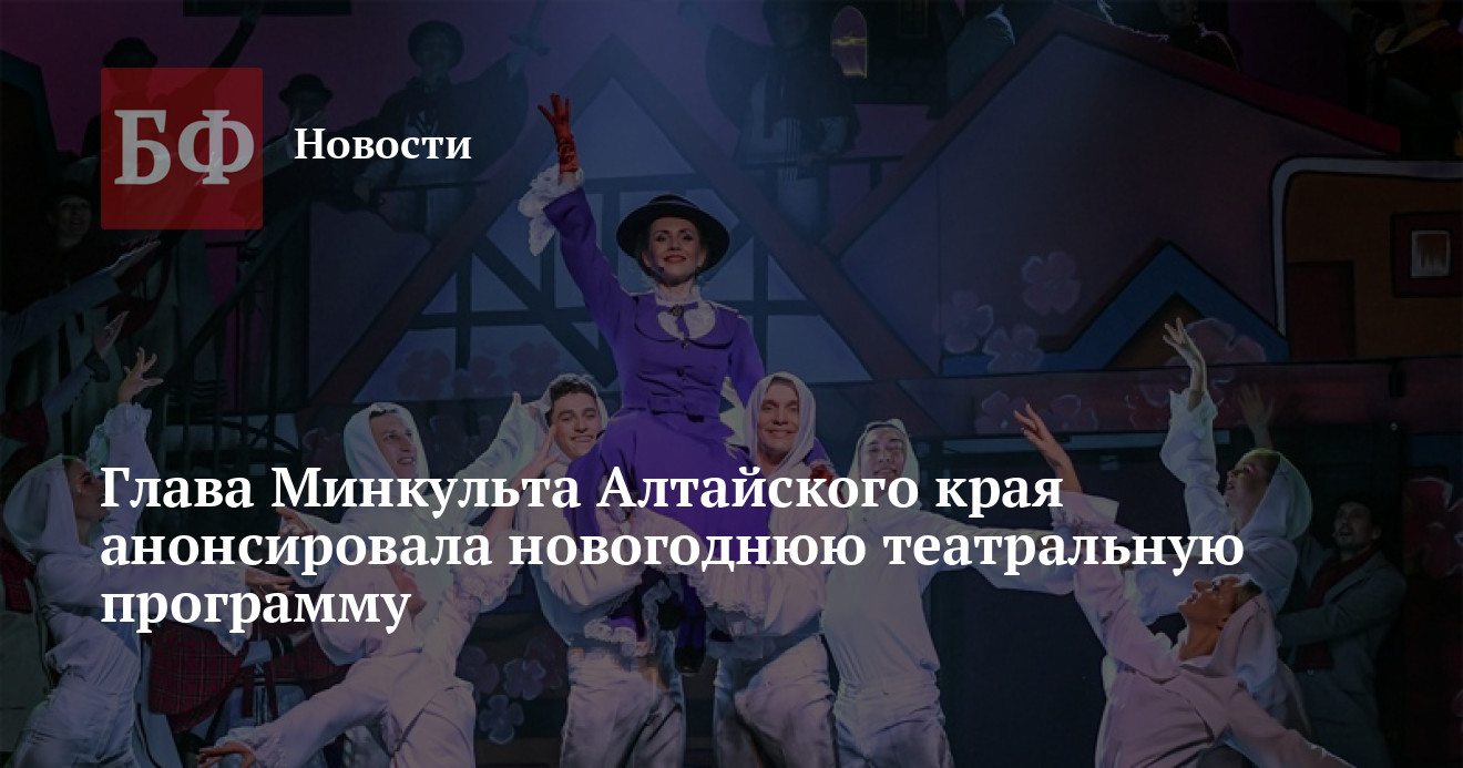 Так, в Алтайском театре драмы состоится премьера сказки «Три орешка для Золушки» и семейной истории «Беги, Маруся». В Молодежном театре Алтая готовится постановка «Тайна третьей планеты» по рассказу Кира Булычева и романтическая комедия «Люблюнемогу» по пьесе Ольги Никифоровой. Музыкальный театр представит мюзикл «Три поросенка», который впервые был показан осенью. Он станет главным детским спектаклем в новогоднем сезоне. Также в репертуаре театра есть мюзиклы «Мэри Поппинс, до свидания!», «По щучьему веленью, или у Емели Новый год», «Новые приключения в Простоквашино». Вечером зрителей ждут мюзиклы «Девчата» и «Служебный роман», а также театрализованная постановка «Чародеи».