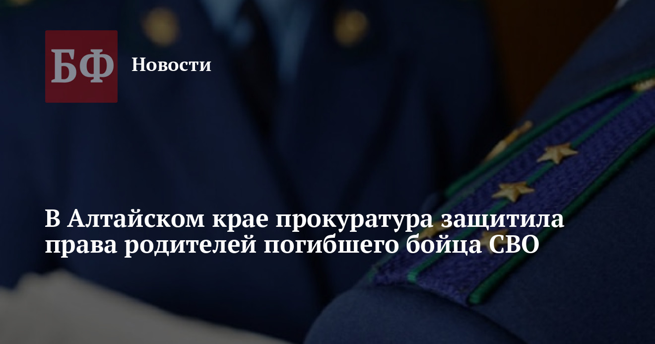 В прокуратуру Тогульского района обратилась семья бойца СВО, который погиб в 2023 году при выполнении воинского долга. В связи с этим родители обратились в отделение Фонда пенсионного и социального страхования РФ по Алтайскому краю с заявлением о назначении государственной пенсии по потере кормильца. Однако в назначении выплат им было необоснованно отказано.