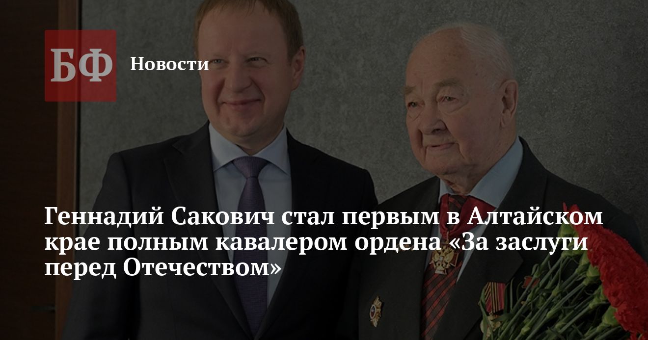 По словам главы региона, Геннадий Сакович стал первым в Алтайском крае полным кавалером ордена «За заслуги перед Отечеством». «От души поздравляю Геннадия Викторовича и его семью с этим событием. Такие успехи наших земляков - гордость всего края», - отметил Виктор Томенко.
