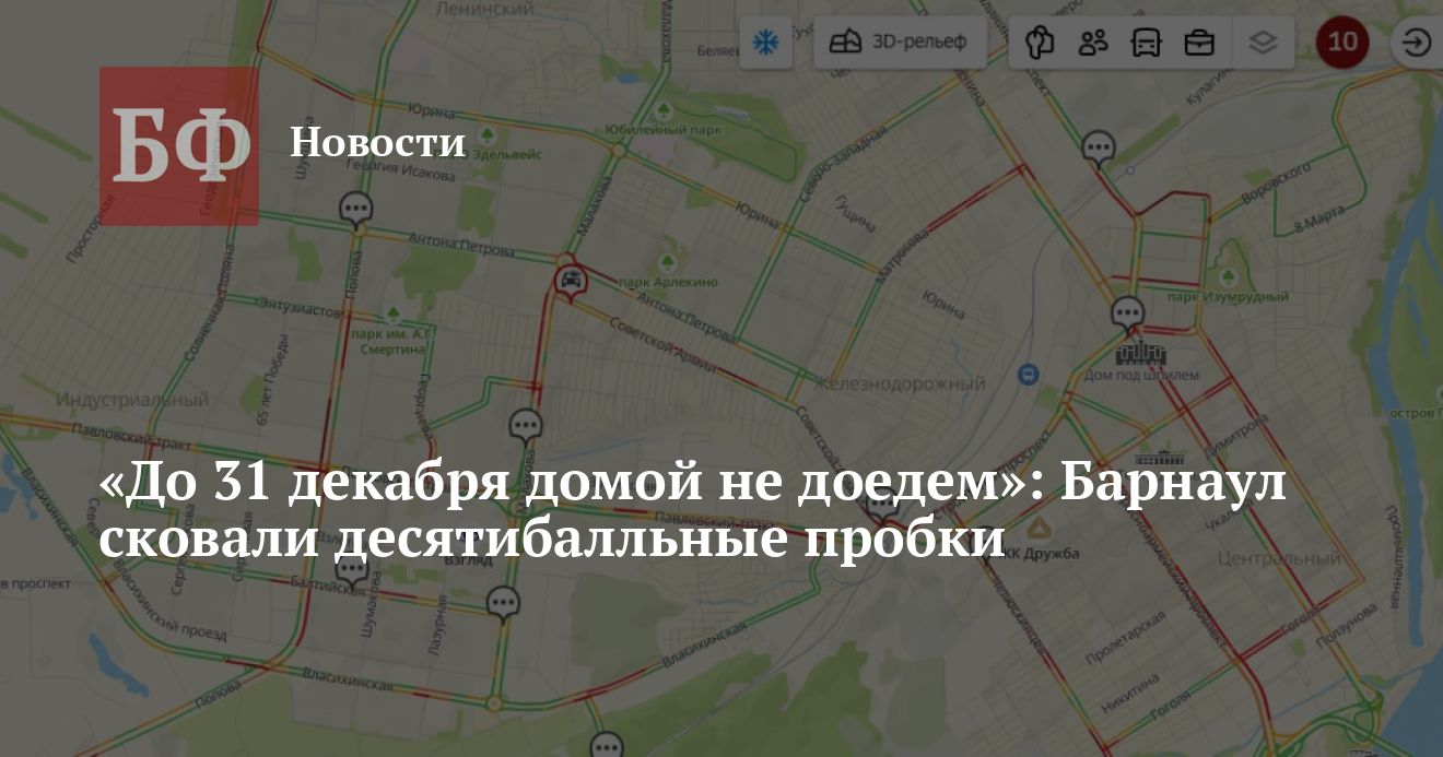26 декабря городские автомобилисты столкнулись с десятибалльными пробками на дорогах Барнаула. Согласно картам «2ГИС», затруднено движение на большей части основных улиц: на Малахова, Ленина, Павловском тракте, Энтузиастов, Попова, Матросова, проспектах Строителей, Красноармейском, Комсомольском и пр.