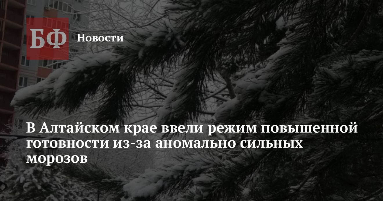 Режим повышенной готовности действует в Алтайском крае с 14 по 22 января в Алтайском крае. Это связано с резким похолоданием. В этот период силы и средства территориальной подсистемы РСЧС переведены в состояние повышенной готовности.