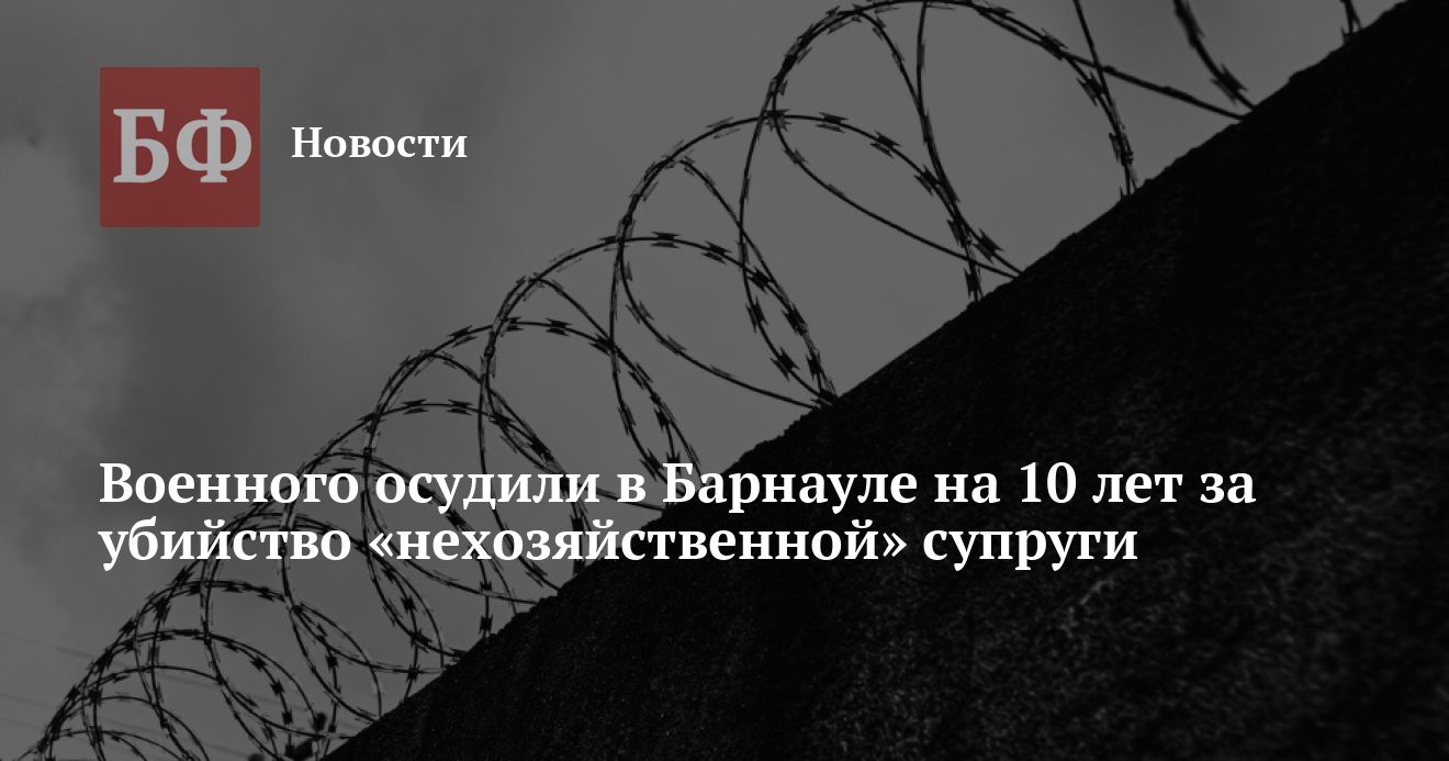 Барнаульский гарнизонный военный суд признал военнослужащего Сергея Барабанщикова виновным в убийстве супруги, которое он совершил, будучи недовольным тем, как она относится к ведению домашнего хозяйства. Как сообщила пресс-служба военных судов, его приговорили к 10 годам колонии.