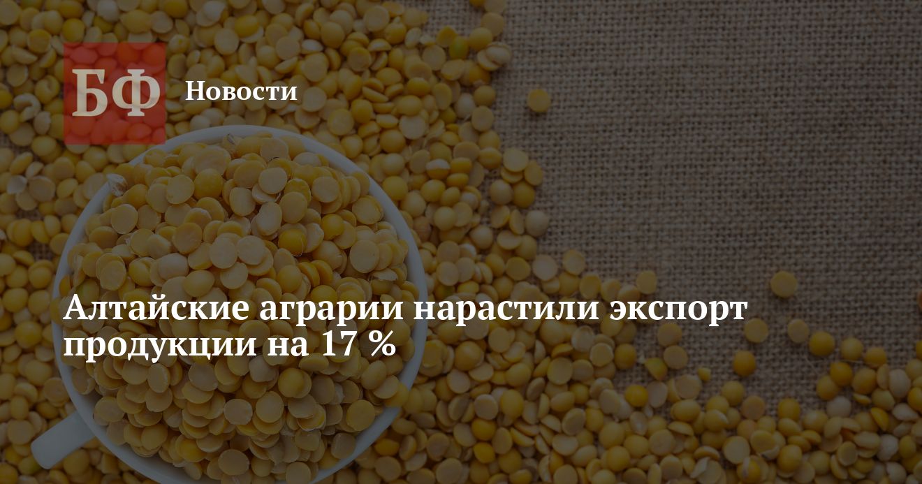 Ключевым драйвером роста стал экспорт зернового сырья, объем которого вырос на 35 % - до 1,1 млн тонн. Наибольшим спросом пользовалась пшеница, основные поставки которой пришлись на Казахстан. Также значительно увеличился экспорт гороха, овса, кукурузы, сои и ячменя. Традиционно сильные позиции сохранила гречиха, почти весь объем которой купил Китай. Помимо того, алтайскую продукцию направляли в Казахстан и Японию.