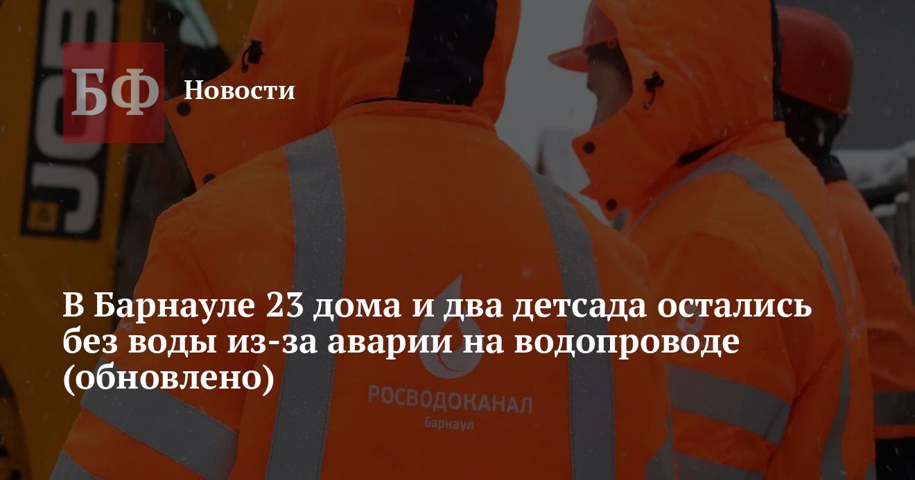 В Барнауле на пересечении улиц Беляева и Глушкова специалисты устраняют повреждение водопровода, из-за чего холодную воду отключили в 23 жилых домах, двух детских садах и еще ряде объектов. Как сообщили в Telegram-канале «Росводоканал Барнаул», для работ перекрыли движение на участке дороги.