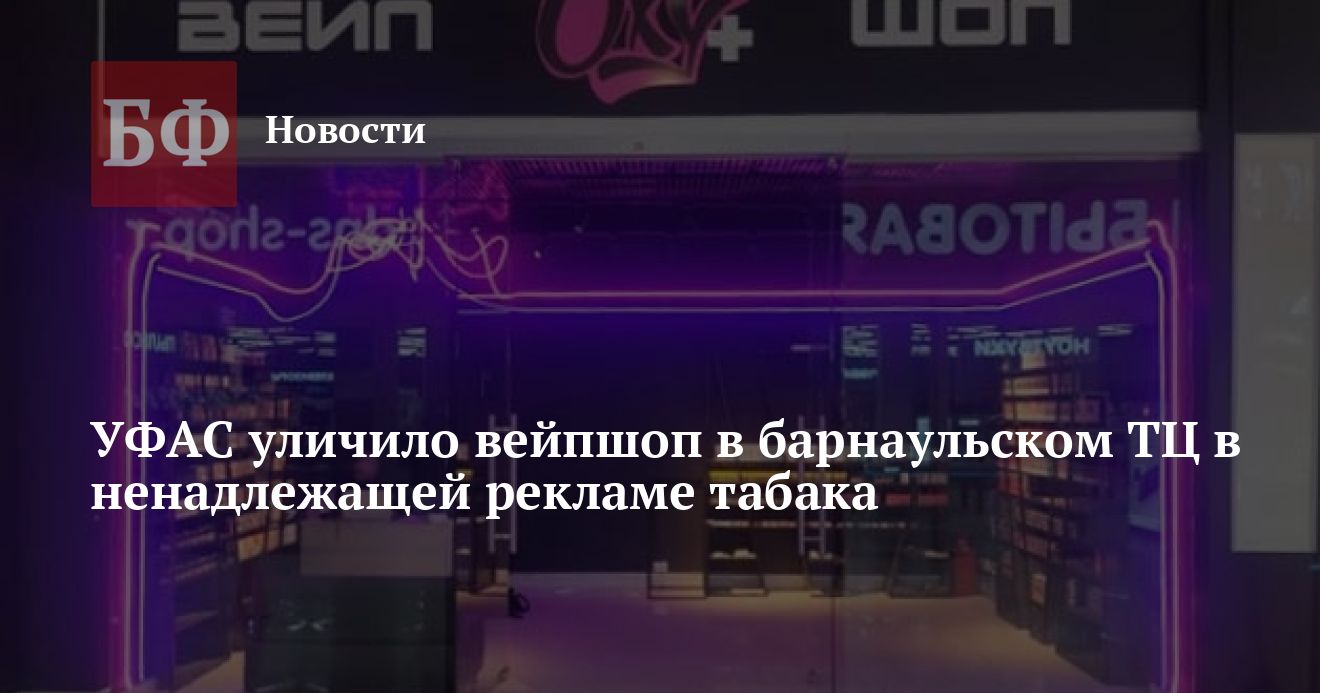Алтайское краевое УФАС признало ненадлежащей рекламу вейпшопа OXY в ТЦ «Огни» в Барнауле. На его фасаде были размещены объявления о продаже электронных устройств для курения и табачных изделий, сообщает пресс-служба регионального антимонопольного органа.