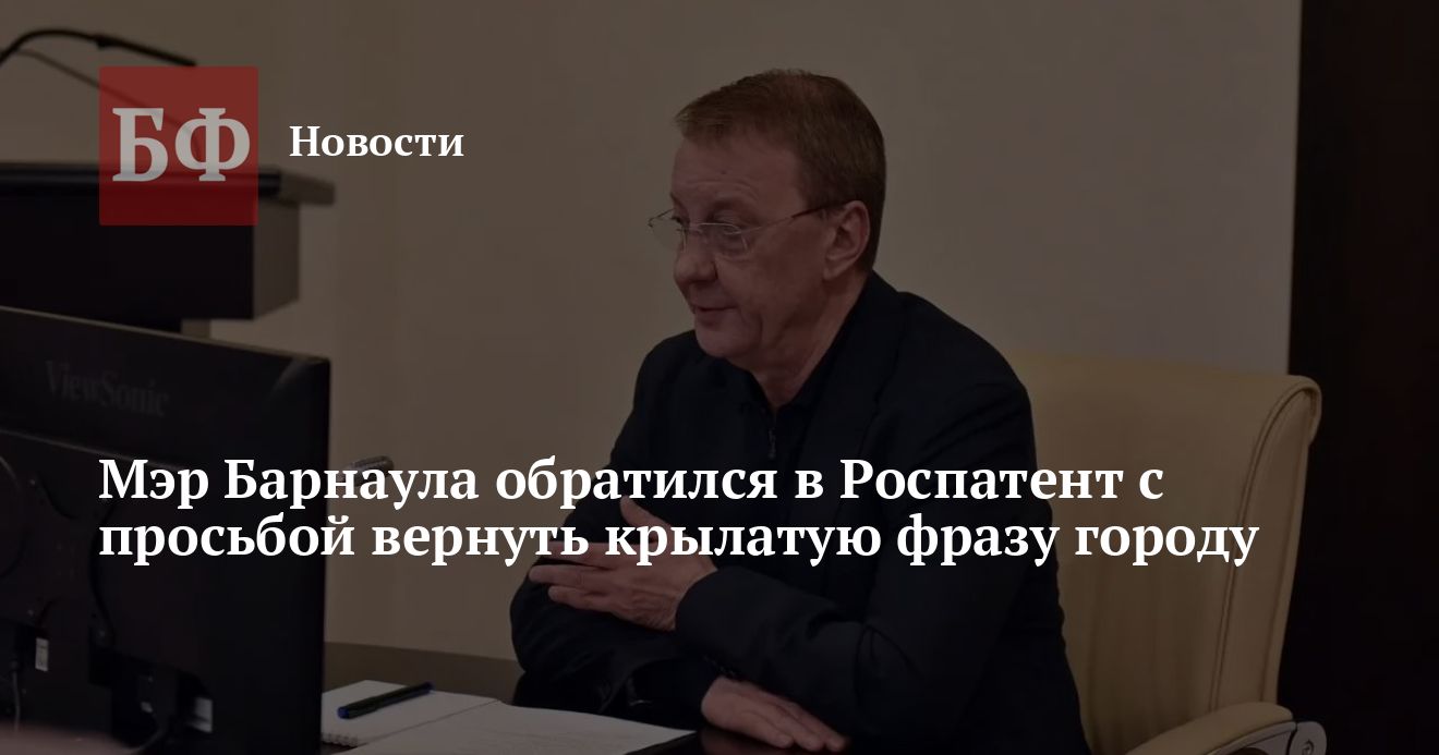 Глава Барнаула Вячеслав Франк обратился к руководителю Федеральной службы по интеллектуальной собственности Юрию Зубову из-за получения патента на фразу «Барнаул - столица мира». В своем письме мэр призвал руководителя службы взять на личный контроль возникшую ситуацию и отметил, что крылатое выражение не может принадлежать одному человеку, пишет «Толк».
