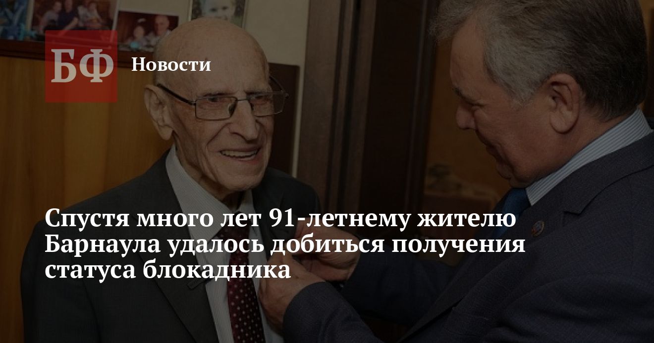 Знак «Жителю блокадного Ленинграда» Виктору Мостакову вручил председатель АКЗС Александр Романенко. Пожилой барнаулец долгое время не мог получить этот статус, так как по документам в осажденном городе он прожил три месяца и три недели, а для присвоения знака требовалось четыре месяца блокадного «стажа».