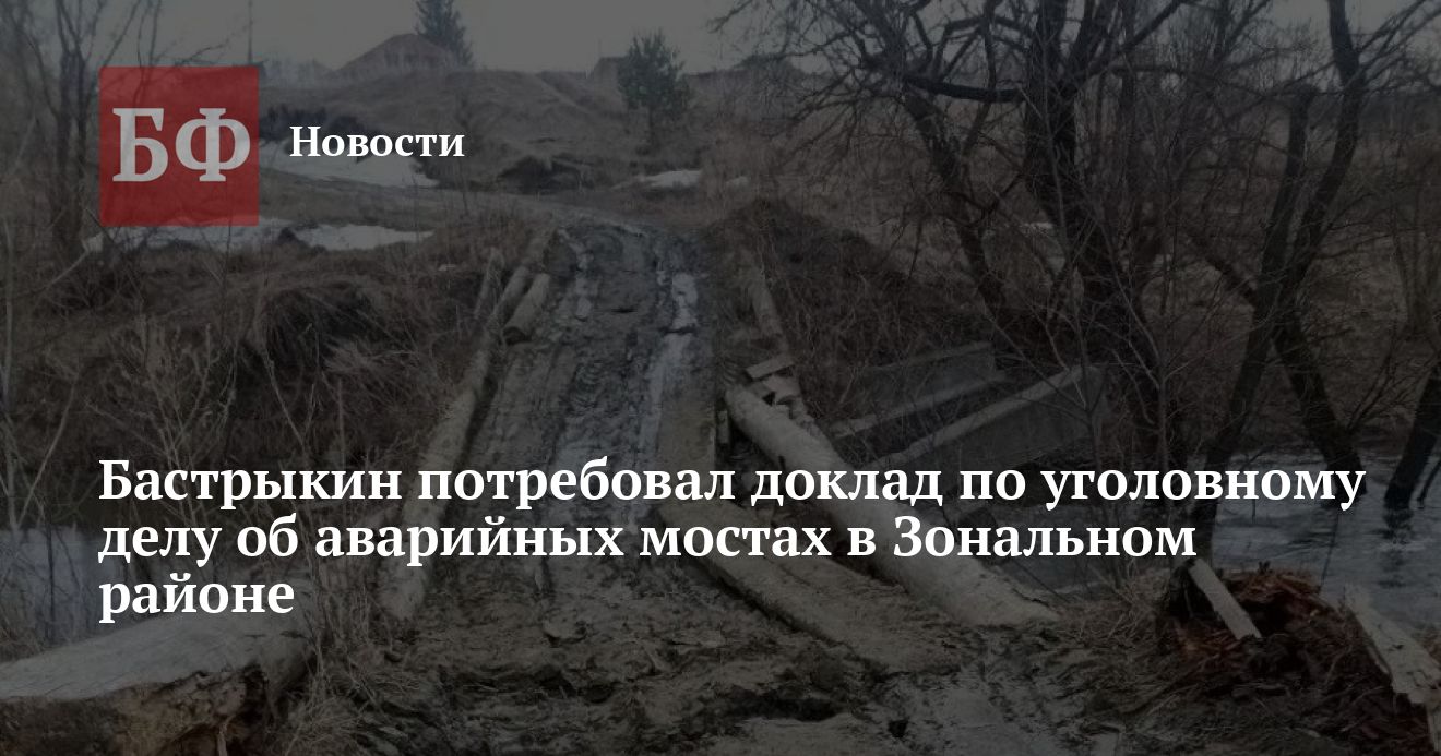 Глава СК России Александр Бастрыкин поручил представить доклад о предварительных и окончательных результатах расследования уголовного дела о ненадлежащей транспортной инфраструктуре в Зональном районе Алтайского края. Как сообщили в следкоме, два моста в муниципалитете долгое время находятся в аварийном состоянии, в связи с чем автомобильное сообщение по ним прекращено, а пешее передвижение сельчан представляет угрозу для жизни и здоровья.