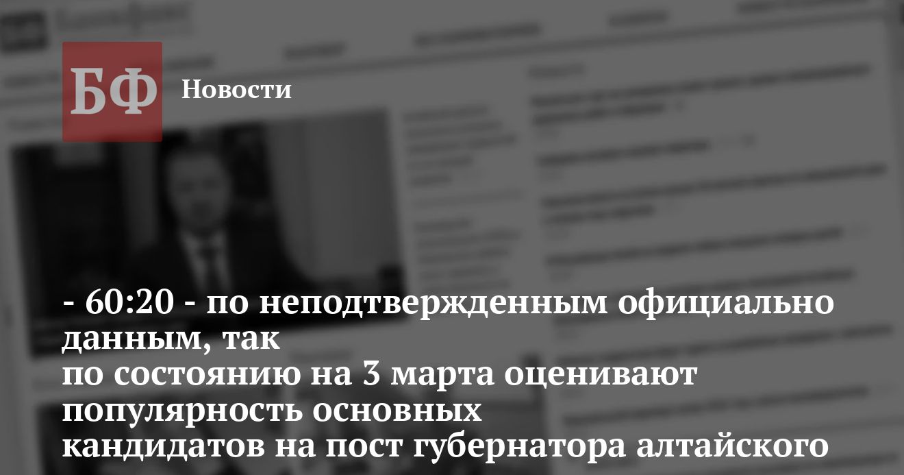 — 60:20 — по неподтвержденным официально данным, так по состоянию на 3 марта оценивают популярность основных кандидатов на пост губернатора алтайского края власти региона.