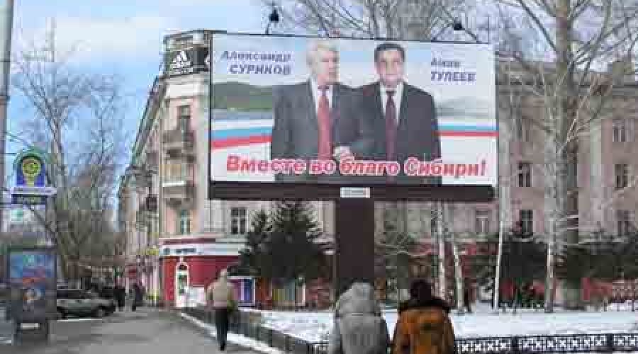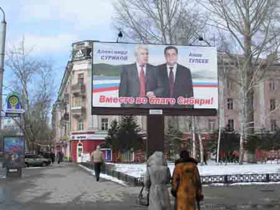 Легко отодвинув плечом своего кемеровского коллегу на второй план, Александр Суриков с плаката выражает уверенность в победе во втором туре.