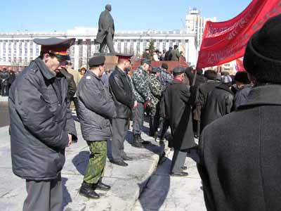 Интересно, что в оцеплении были задействованы не только милиционеры (которых было порядка 50 человек, не считая подогнанных к заднему фасаду здания автозаков), но и сотрудники ЧОПов. По словам частных охранников, не имевших при себе никаких документов, они были мобилизованы ГУВД «для усиления режима охраны». Оцеплена была и трибуна — собравшиеся на ней вожди, ораторы и удобно расположившаяся сзади группа чиновников крайадминистрации и депутатов крайсовета, отсеченная цепочками сотрудников МВД, по-видимому, стали иллюстрацией озвучившихся сверху призывов руководителей региона к готовности к «диалогу с гражданским обществом».