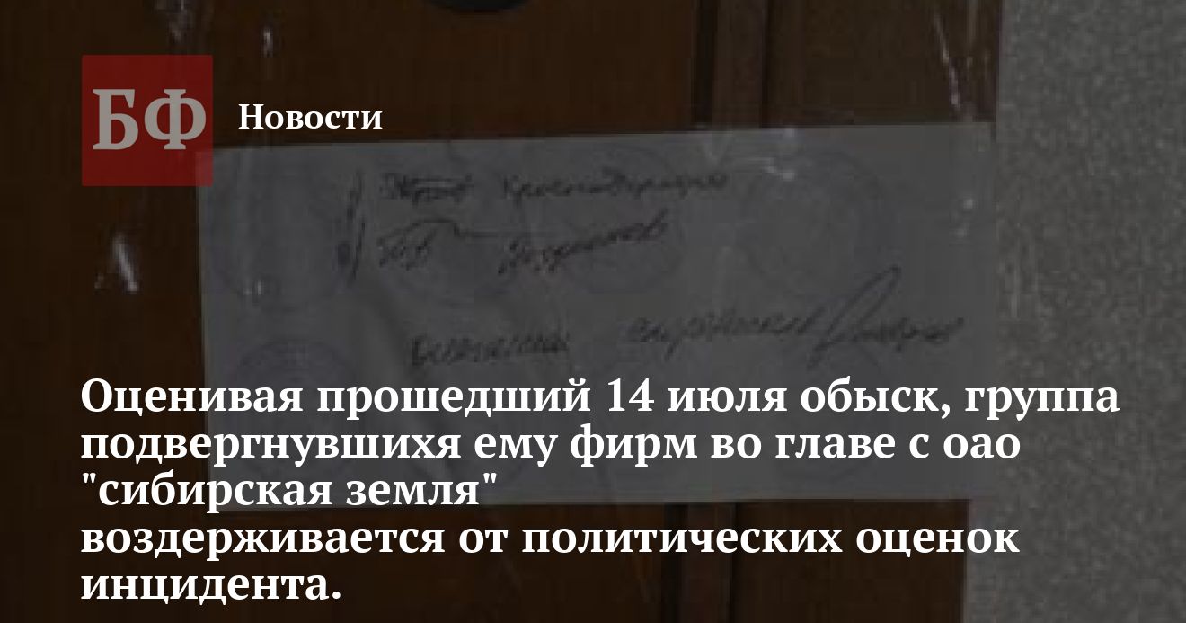 Обыск был начат 14 июля в 9 часов утра и закончен 15 июля в 2 часа ночи. При этом в следственную бригаду численностью около 10 человек, помимо милиционеров предположительно Октябрьского РОВД (предположительные руководители — следователи Иванов или Шведов), входила также и осуществлявшая оперативное сопровождение группа офицеров ФСБ (предположительный руководитель — майор Кулешов). Как сообщил член Совета директоров „Сибирской земли“ Евгений Федотов, деятельность „Сибирской земли“ уже около 3 лет привлекает не вполне понятное предпринимателям внимание ФСБ (журналистам были продемонстрированы ряд запросов УФСБ по АК, касающихся операций с акциями ОАО „Барнаултрансмаш“). Федотов также сообщил, что уголовное дело, в рамках которого был проведен обыск, возбуждено не менее полугода назад (предположительно, речь может идти об уголовном деле N11545, возбужденном Барнаульской транспортной прокуратурой по п."В» части 2 ст.160 УК РФ (в уже не действующей сегодня редакции УК речь там шла о присвоении или растрате, совершенной должностным лицом с использованием своего служебного положения).
