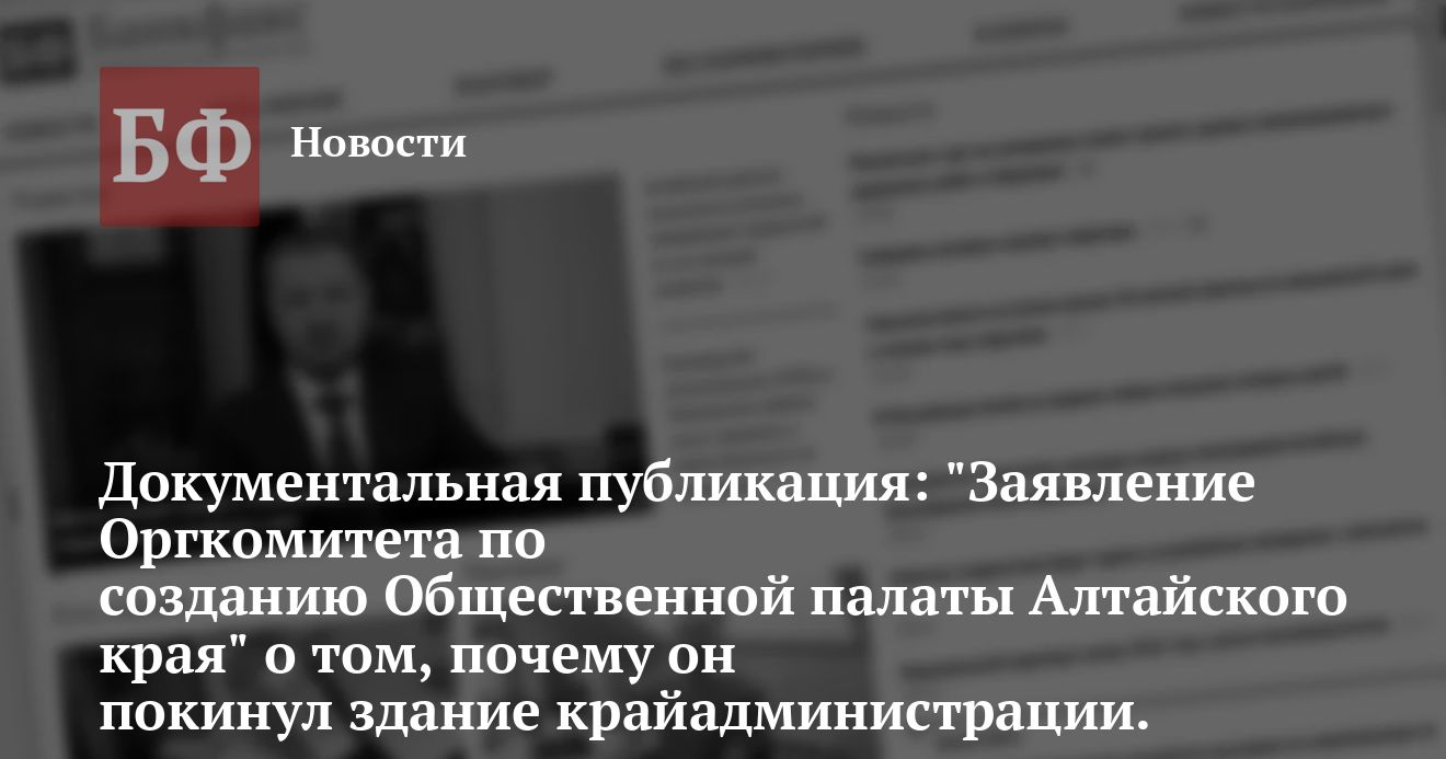 Оргкомитет по созданию Общественной палаты Алтайского края, объединяющий 117 общественных формирований края, сегодня покинул стены здания администрации Алтайского края, где он находился с февраля и вел всю работу по консолидации общественных сил. Тем самым Оргкомитет выражает свое несогласие с действиями нового заместителя губернатора края Михаилом Козловым, который продемонстрировал за короткое время пребывания на своем посту полное отсутствие заинтересованности в общественной жизни края. Поскольку общественные организации сегодня представляют производственные, культурные организации, за которыми стоят многотысячные коллективы, то как результат за этим стоит невнимание к нуждам и проблемам населения края в целом.